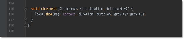 void showToast(String msg, {int duration, int gravity}) {
