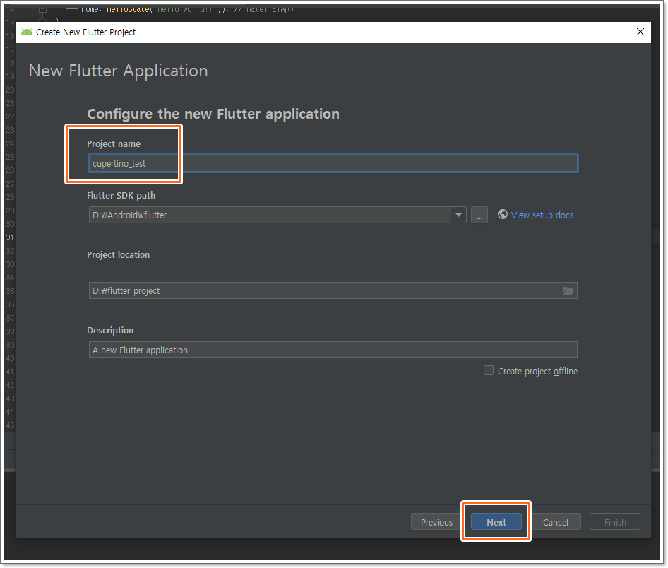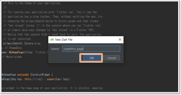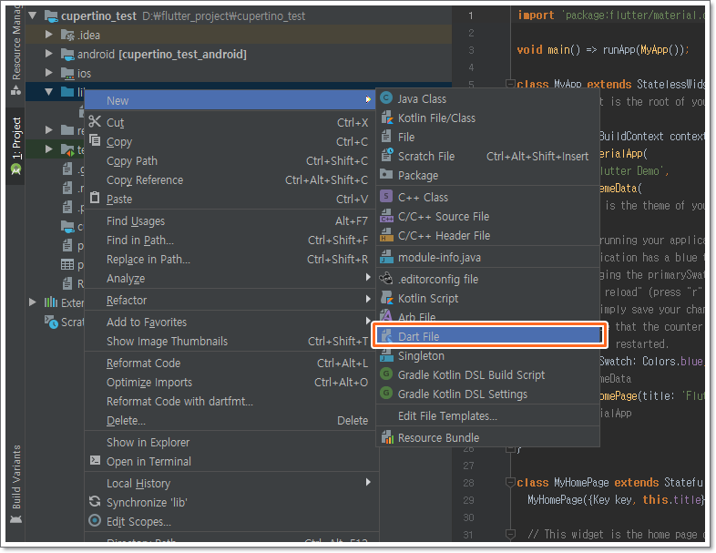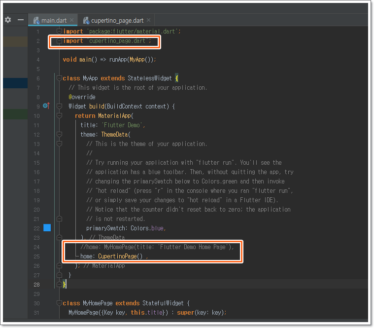 main.dart는 위쪽 스샷처럼 한 줄만 변경하면 되므로 따로 소스코드를