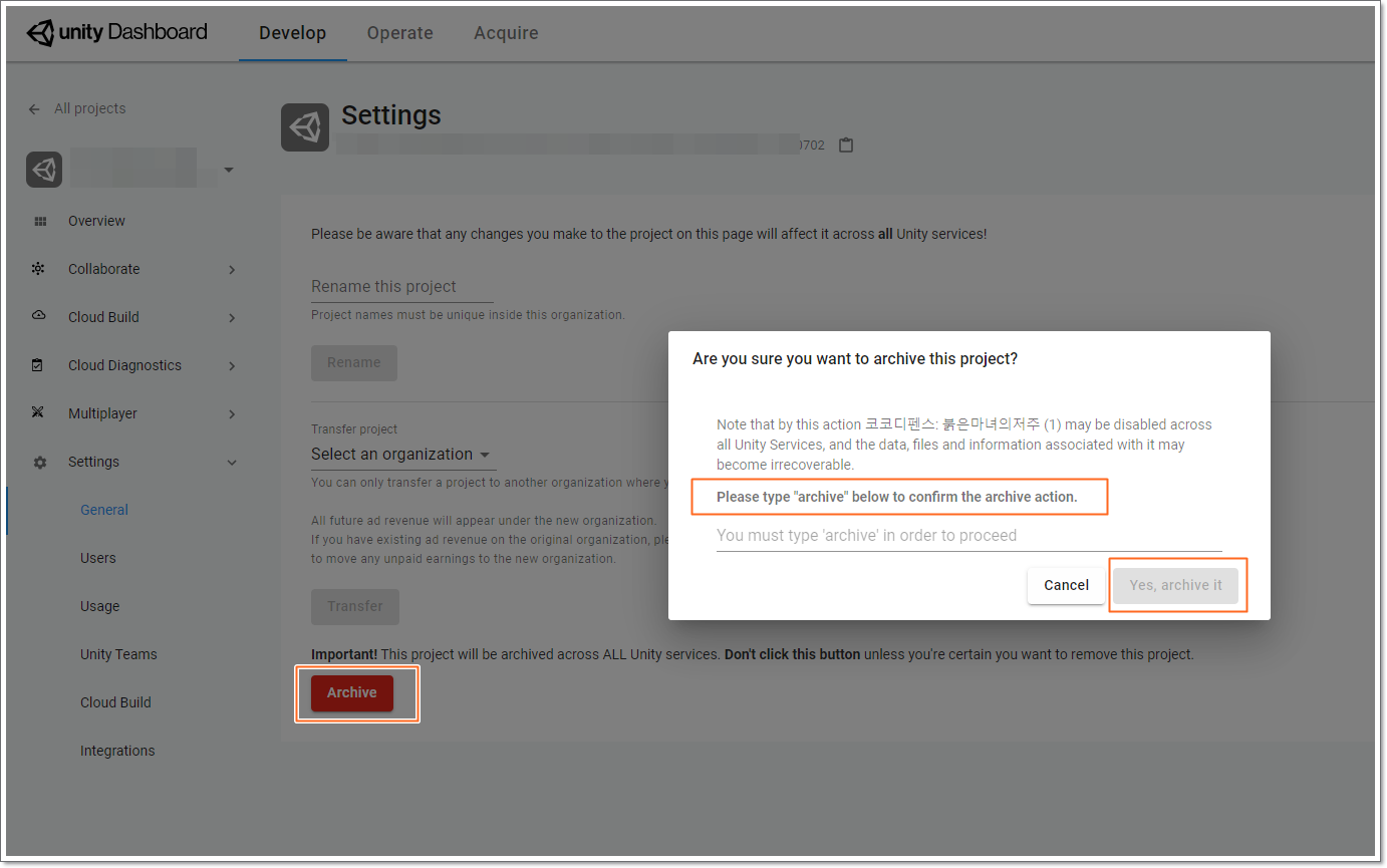 유니티 대시보드 프로젝트 삭제하는 방법