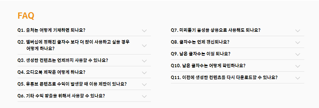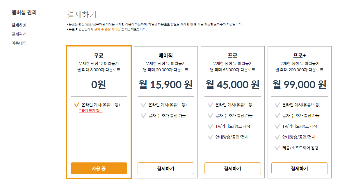 무료 라이선스는 월 3,000자 까지 다운로드 할 수 있는데, 개인적으로 저는 충분히 이용하고도 남을 듯 합니다. 앱 프로모션 유튜브 영상 나래이션용으로 한 번 제작해봤는데 200 자도 체 사용하지 않은 것 같습니다. 자기가 작성한 글자수 만큼 파일로 다운로드 하면 그만큼 차감되는 형식인데 그냥 미리듣기도 들을 수 있긴 하지만 미리듣기를 사운드를 따로 녹음해서 사용하는 것은 정책에 위배되므로 주의하시기 바랍니다!