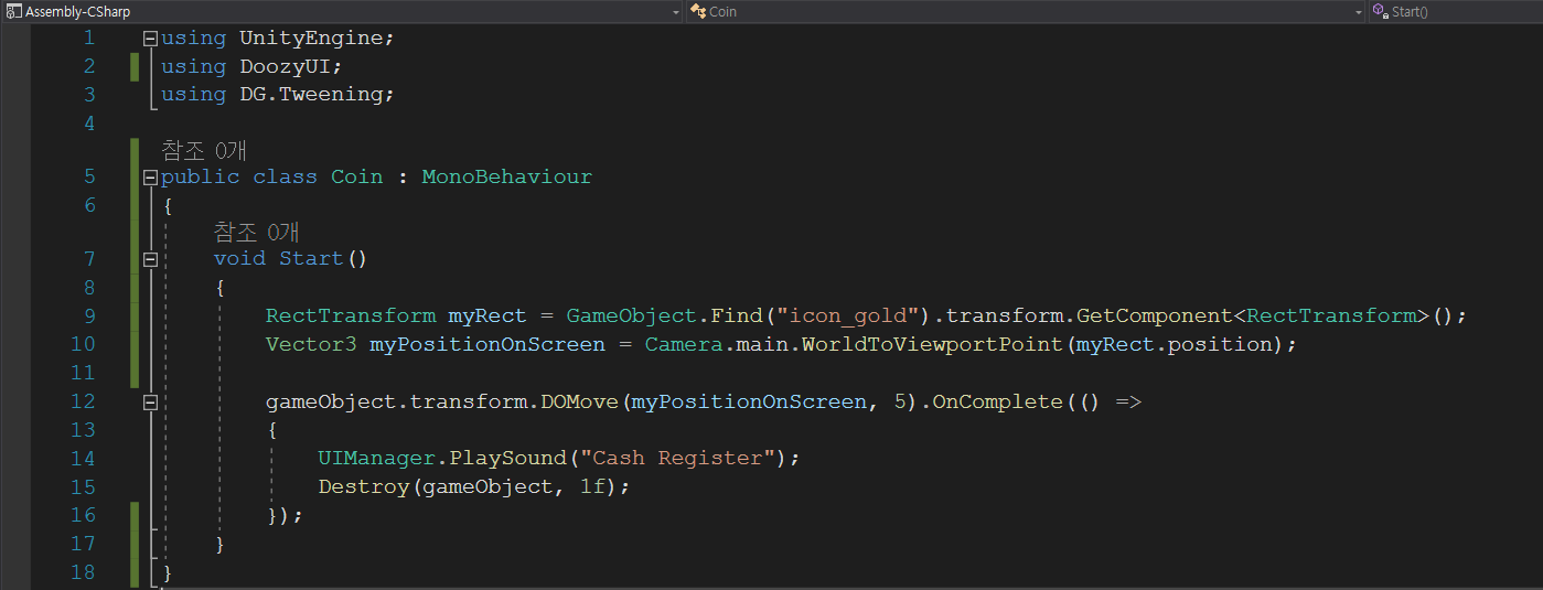 아 간단히 플레이어에게 다가오는 코인자석은 그냥 맵 상에 있는 코인의 컬라이더를 이따시만하게 크게 만들어서 플레이어가 코인의 컬라이더에 닿았을 때 그냥 코인이 플레이어에게 다가가서 이펙트가 터지게 만들면 됩니다. 둘 다 월드좌표계에 있기 땜시 좌표 변환을 하지 않아도 되기에 별 무리 없이 구현할 수 있습니다. 보통 처음 코인자석을 구현할 때 유니티 좌표계 땜시 혼란을 겪게 되는데요. 월드좌표계, 스크린좌표계 간의 변환땜시 저도 혼란을 많이 겪었는데, 이번 포스팅의 이유는 다음부터 삽질하지 않고 그냥 제 포스팅을 참고하려고 하는 간단한 포스팅입니다.