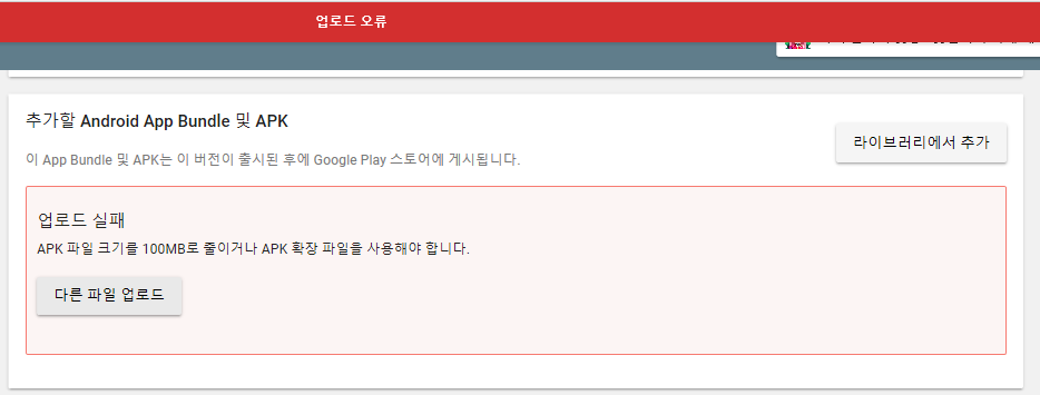 apk 용량이 100메가바이트를 초과하면 이런 업로드 오류가 똭! 뜹니다.