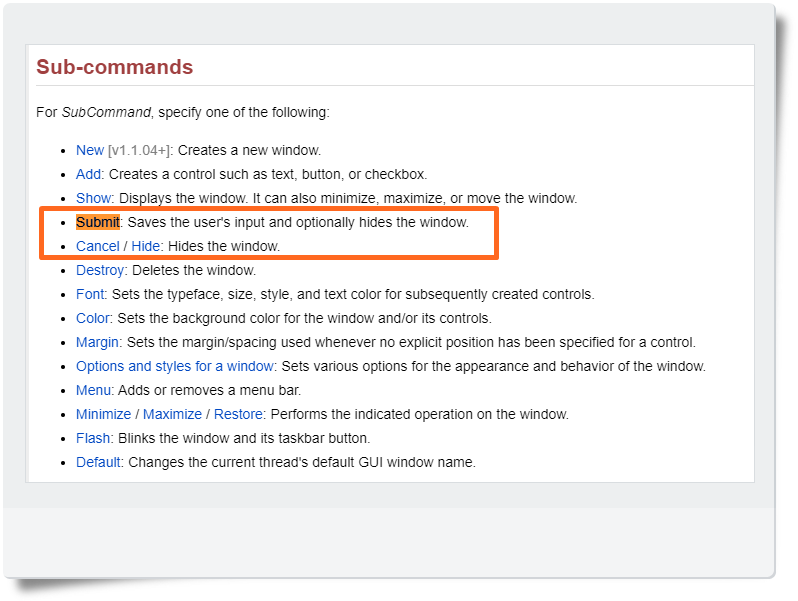 각 컨트롤의 내용을 Associated Variable(관련변수) (있는 경우)에 저장하고 NoHide옵션이 없는 경우 창을 숨깁니다.