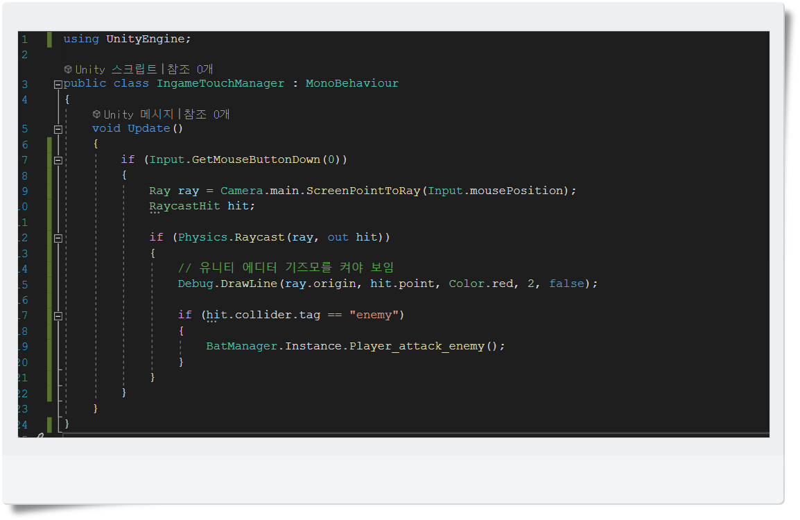 이번 포스팅의 주제는 월드좌표 터치 디버깅(Debug.DrawLine)에 관한 내용입니다.