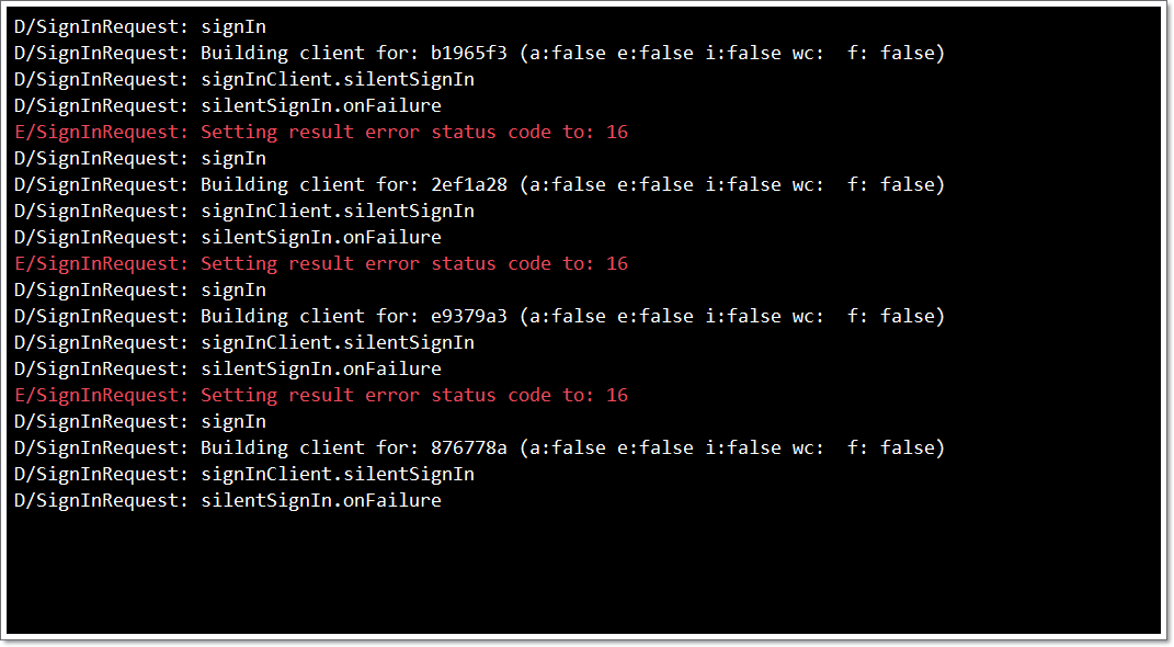 로그캣을 보니 E/SignInRequest: Setting result error status code to: 16 이라고 에러가 뜨네요