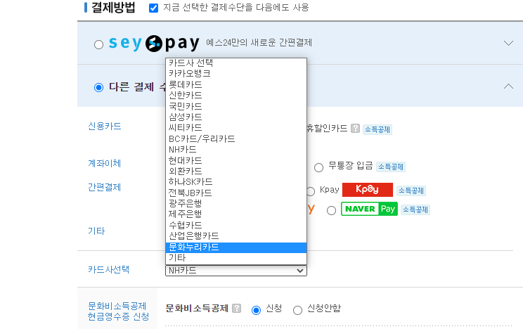 결론은 문화누리카드가 NH카드인데, 위에 NH카드를 선택해서 결제하면 안되고,