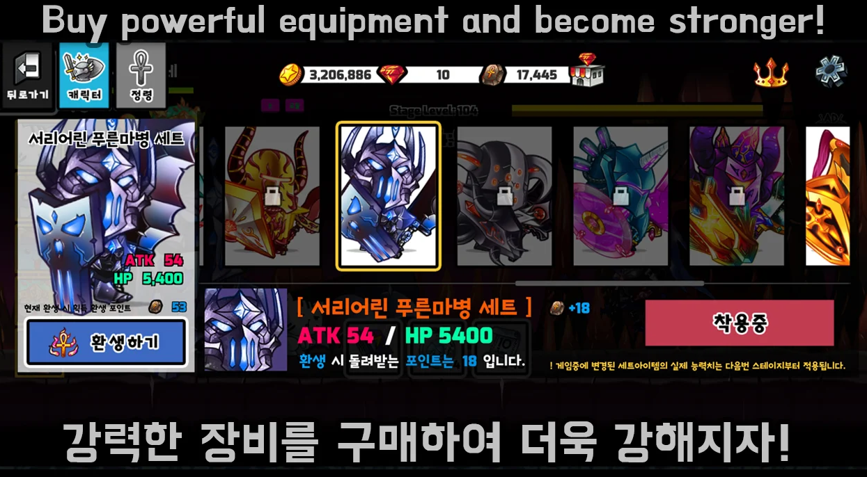 다양한 아이템세트를 획득하고 환생을 하여 환생포인트 획득!
