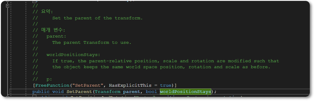 worldPosionStays 인자가 참일 경우 개체가 이전과 동일한 월드 위치, 각도, 스케일을 유지하도록 부모오브젝트와 관계에 의해 상대적으로 수정된다고 한다.
