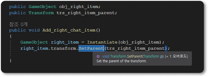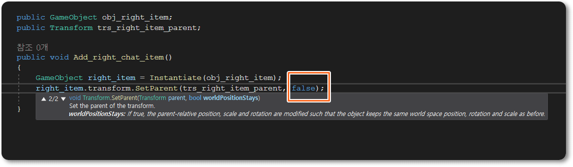 SetParent 함수를 사용할 때 인자로 그냥 부모 오브젝트의 트랜스폼만 사용했을 경우 동작하긴 하는데 자식 오브젝트의 스케일이 70배 이상 커졌다. 이럴 때 당황하지 말고,
