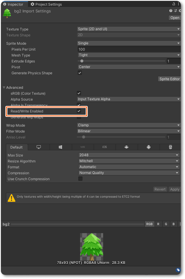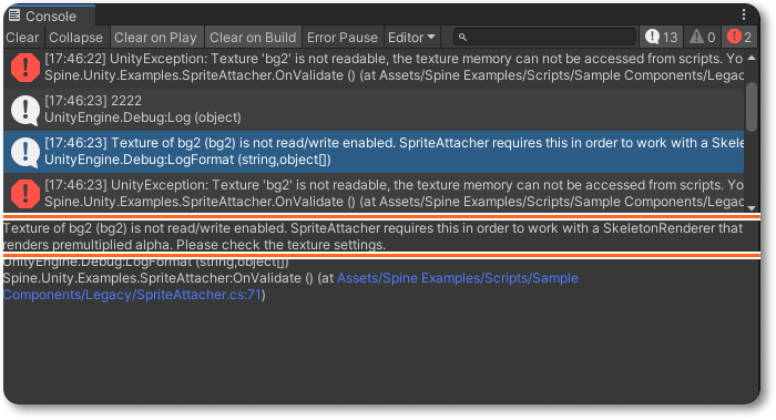 Texture of bg2 (bg2) is not read/write enabled. SpriteAttacher requires this in order to work with a SkeletonRenderer that renders premultiplied alpha. Please check the texture settings. 이런 식으로 에러가 뜬다. 여기에서 사용한 bg2 텍스쳐가 읽기/쓰기가 불가능하다는 메시지.