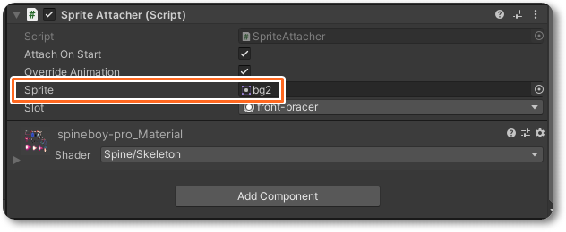 SkeletonAnimation 컴포넌트가 붙어있는 GameObject에 Sprite Attacher 컴포넌트를 추가한 후 인스펙터에 Sprite에 해당 sprite에 넣어주고, Slot도 원하는 slot을 선택해주고 실행을 하면
