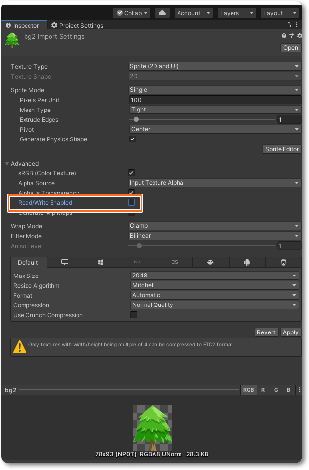 Texture of bg2 (bg2) is not read/write enabled.
