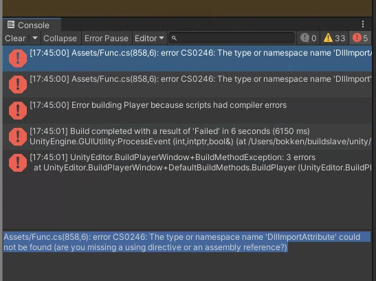 유니티 iOS 빌드중에 error CS0246: The type or namespace name 'DllImportAttribute' could not be found 에러 뜰 때