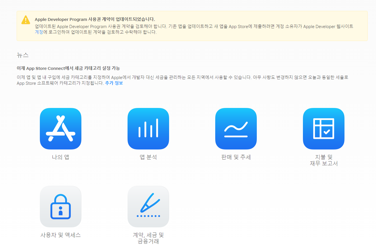라이선스 계약에 동의하면 될 것 같으니 일단 App Store Connect 로 이동해본다.