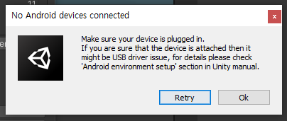 No Android devices connected Make sure your device is plugged in, If you are sure that the device is attached then it might be USB driver issue, for details please check 'Android environment setup' section in Unity manual.