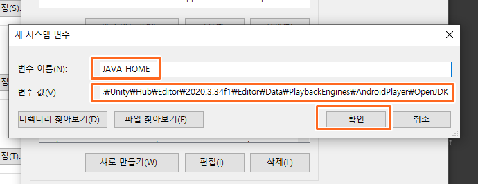 먼저 JAVA_HOME 변수를 만들어 주고 변수 값에다가 아까 복사한 경로를 붙여넣기 후 확인버튼 클릭