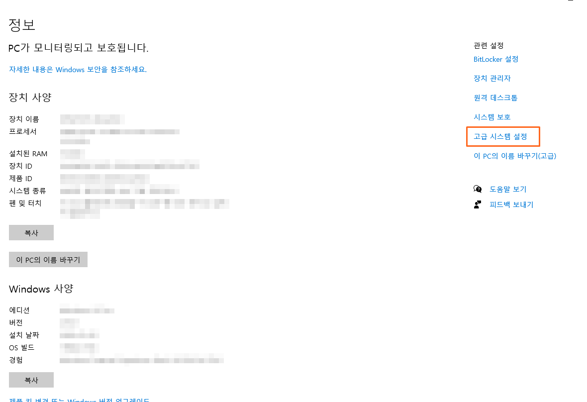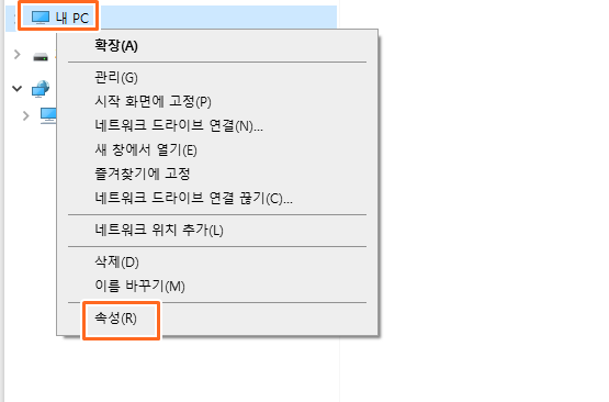 윈도우 탐색기에서 내PC 우클릭 > 속성