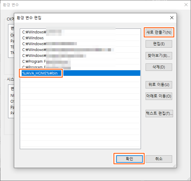 %JAVA_HOME%\bin 을 입력 후 확인버튼 클릭