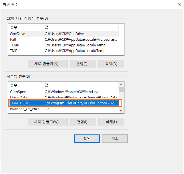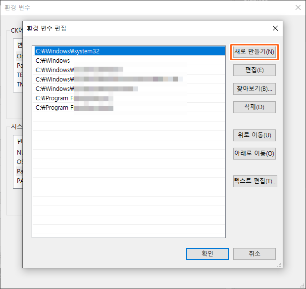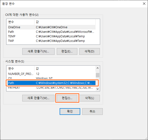 사용자 변수와 시스템 변수가 있는데 시스템 변수에 만들었다. 각자 본인의 상황에 맞게