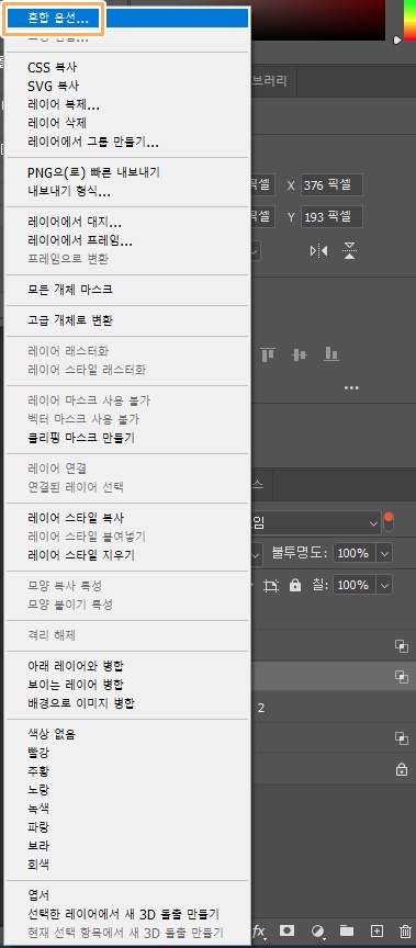 고급 혼합에 투명 모양 레이어(T) 이게 꺼져있는데 그거를