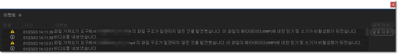 파일 가져오기 도구에서 파일 구조가 일관되지 않은 것을 발견했습니다. 이 파일의 메타데이터(XMP)에 대한 읽기 및 쓰기 가 비활성화가 되었습니다.