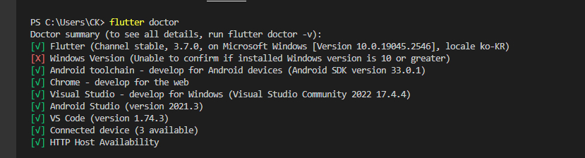 플러터 SDK 버전을 3.7.0으로 업그레이드를 하니 windows version 블라블라 이슈가 뜬다.
