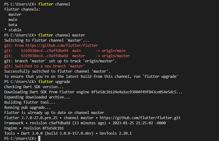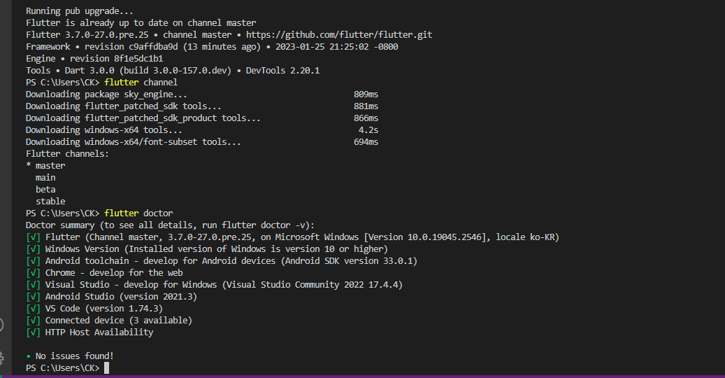 채널 변경을 하고나서 버전이 이미 3.7.0이긴 하지만 flutter upgrade 를 한 번 더 실행해줬다.