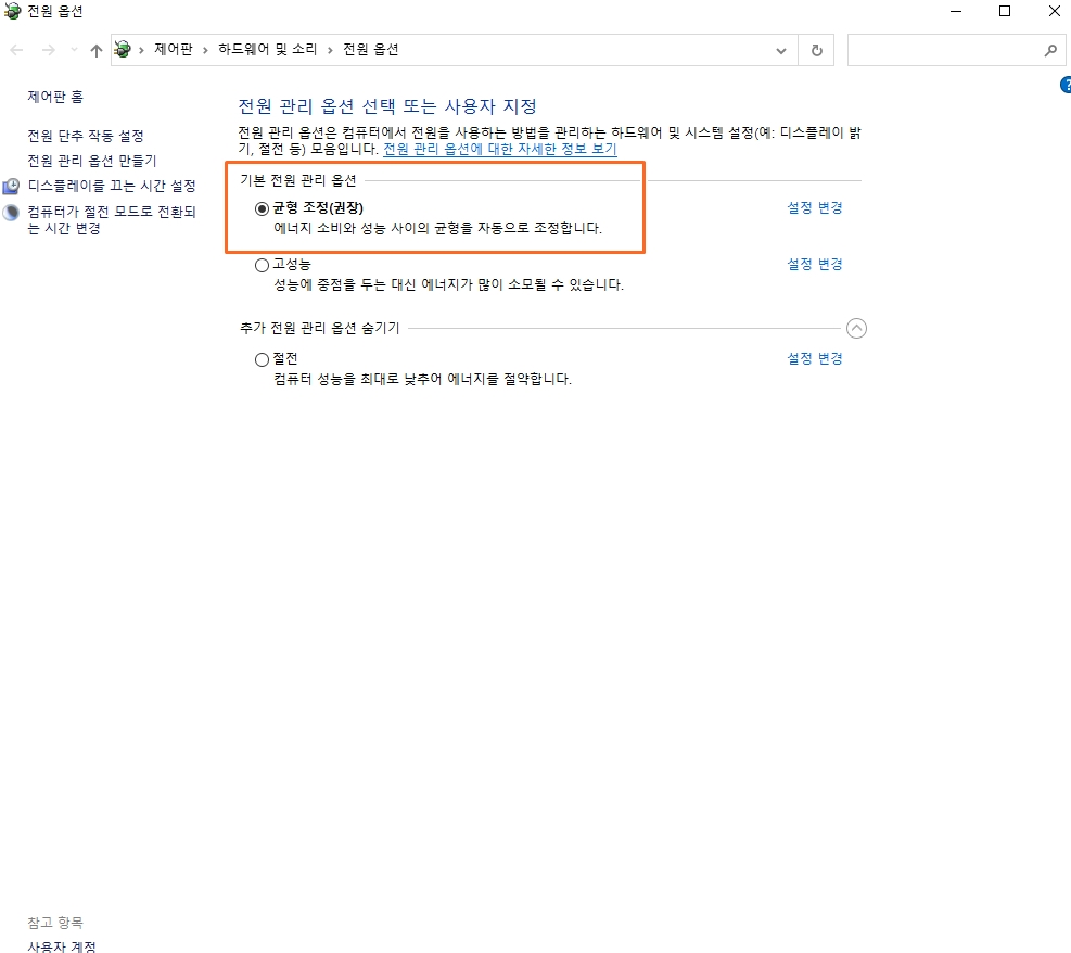 기본 전원 관리 옵션을 고성능 -> 균형 조정(권장) 으로 변경해준 뒤 다시 실행하면 잘 된다.