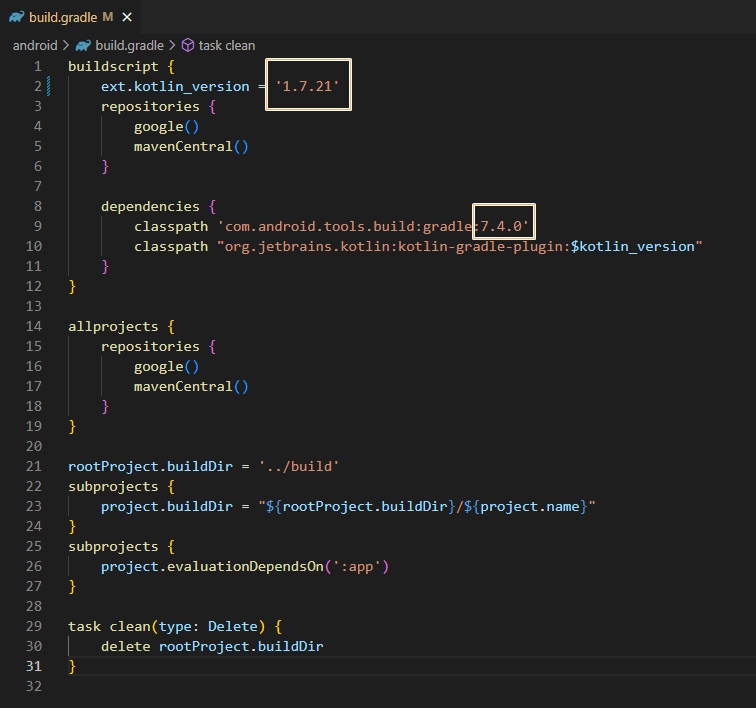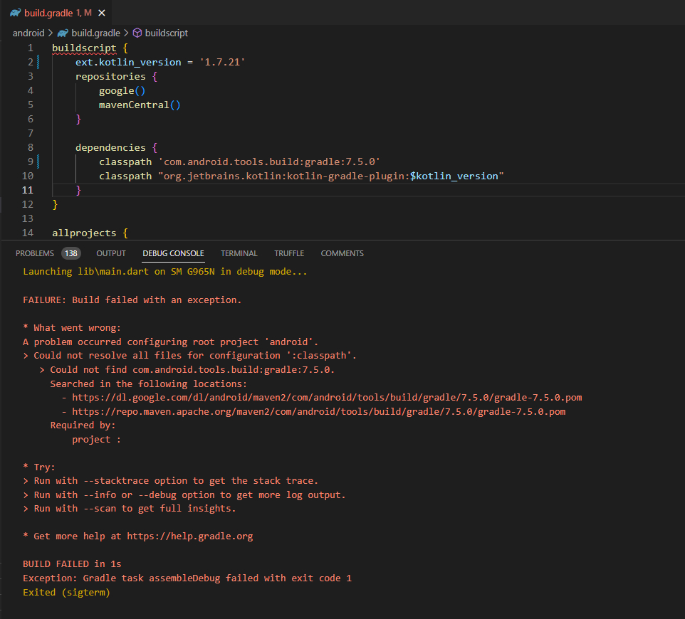 [Flutter] 플러터 Gradle Error: FAILURE: Build failed with an exception. * What went wrong: A problem occurred configuring root project 'android'. > Could not resolve all files for configuration ':classpath'