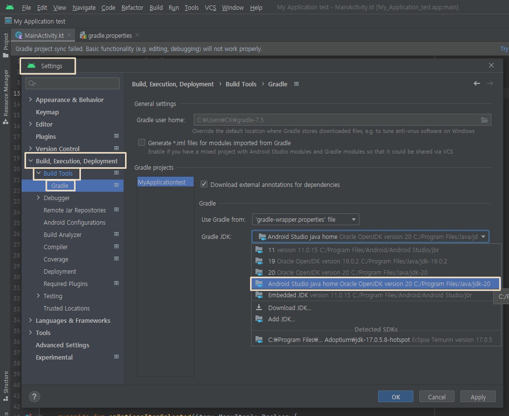 깃에서 pull 한 상태그대로의 모습. 코틀린 버전이 1.7.21, 그래들 버전이 7.5.0 으로 되어있다.
