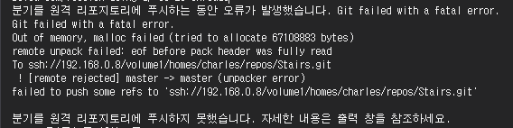 Git failed with a fatal error.Git failed with a fatal error.Out of memory, malloc failed (tried to allocate 67108883 bytes)remote unpack failed: eof before pack header was fully readTo ssh://192.168.0.8/volume1/homes/charles/repos/Stairs.git ! [remote rejected] master -> master (unpacker error)failed to push some refs to 'ssh://192.168.0.8/volume1/homes/charles/repos/Stairs.git'
