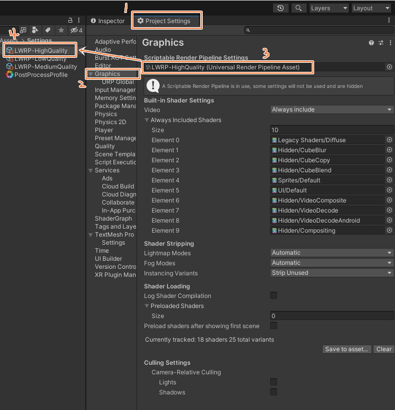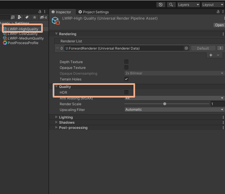 안드로이드에서는 별 이상이 없는데 맥에서 빌드하려고 해당 프로젝트를 실행하면 화면에 노란색이 깜빡거리는 현상이 발생한다. Project Setting > Graphics 에 Scriptable Render Pipeline Settings 에 사용되고 있는 URP Asset이 LWRP-High Quality 인데
