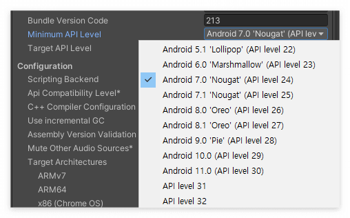 기존 Minimum API Level이 22이었는데 24로 올려주니 빌드가 잘 된다.