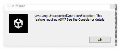 java.lang.UnsupportedOperationException: This feature requires ASM7 See the Console for details. 팝업이 뜨면서 빌드실패