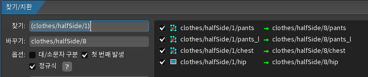 바꾸기칸에는 1/halfSide/$1 이런식으로 입력하면 원래 /Images/arm_l 이 /Images/1/halfSide/arm_l 이런식으로 일괄변경된다. 참 쉽다. 개꿀.