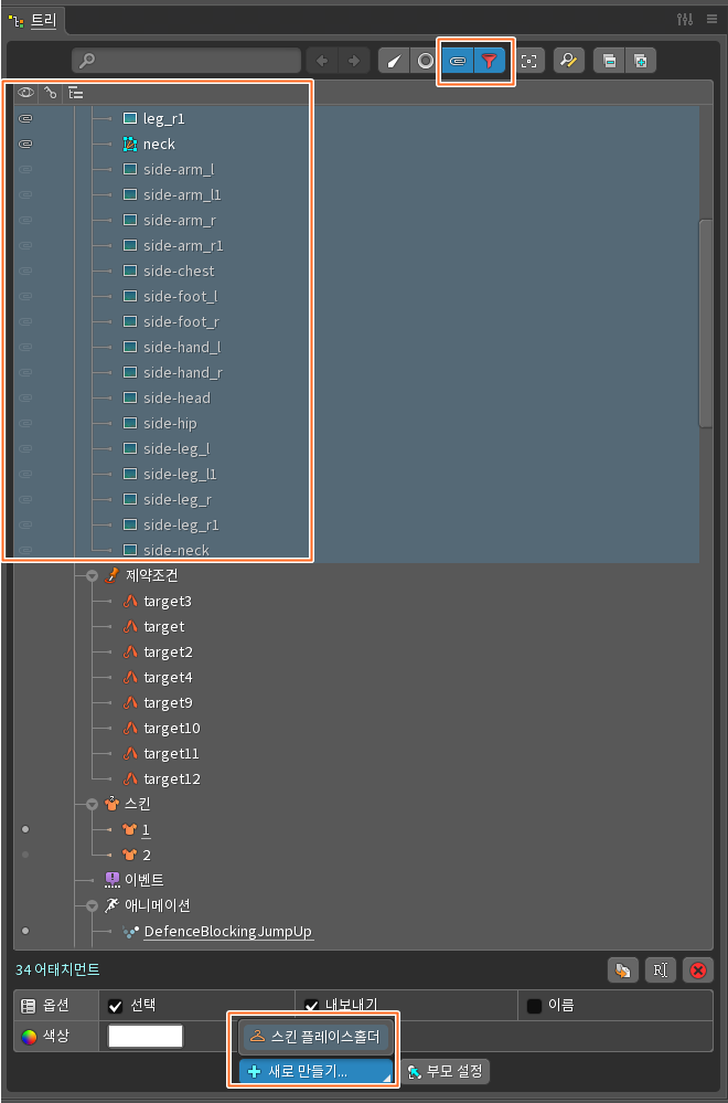 트리뷰에서 어태치먼트 필터링을 한 후 어태치먼트들를 모두 선택한 뒤 맨아래 '새로 만들기' '스킨 플레이스 홀더'를 클릭