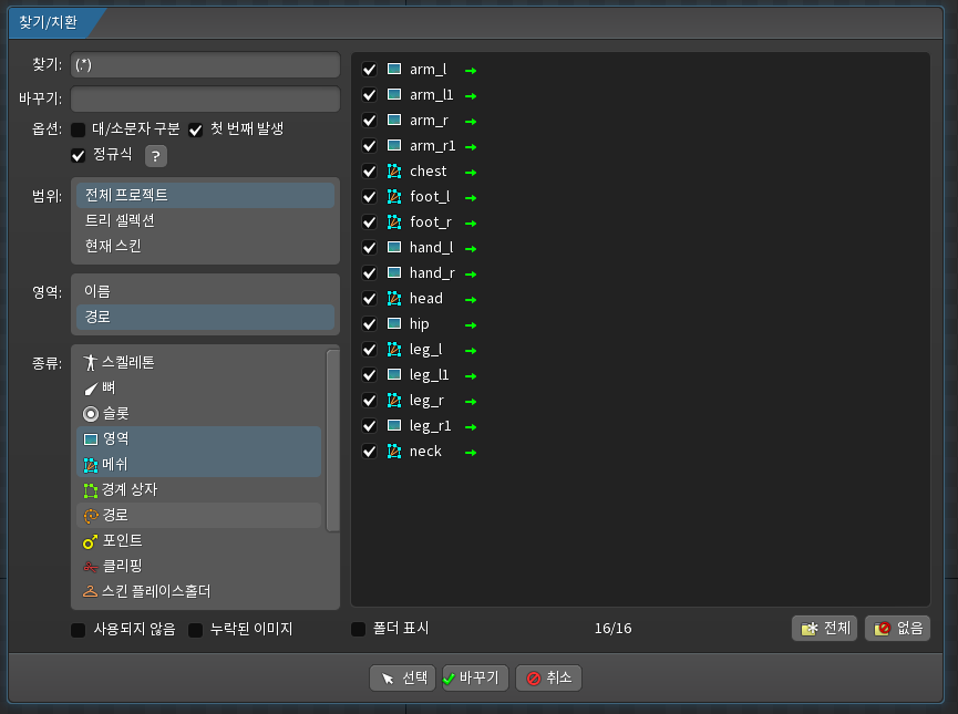 아래 이미지 처럼 찾기에다가 (.*)를 입력하고, 첫 번째 발생 체크, 정규식 체크, 범위는 전체 프로젝트를 해도 되고 이미 스킨이 있다면 현재스킨 또는 트리에서 선택한 범위(트리 셀렉션) 을 선택하면 된다. 그리고 경로를 변경할 예정이므로 경로를 선택, 이미지만 변경할 예정이므로 이미지로 사용한 영역, 메쉬(메쉬를 하나도 사용안했으면 선택 안해도 됨)