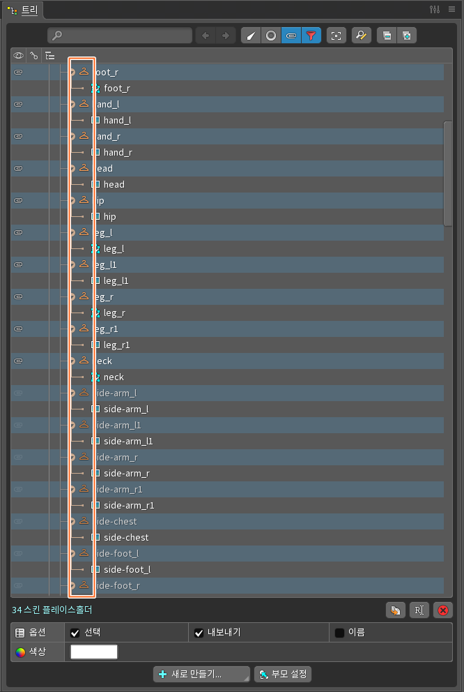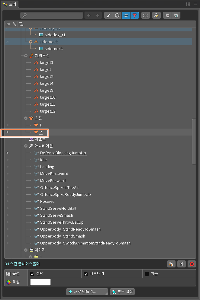 범위를 전체프로젝트로 하는 경우는 예를 들어 1번 스킨과 2번 스킨의 뼈대의 구조가 달라지거나(예: 없던 꼬리 추가) 추가되거나 하는 경우이다