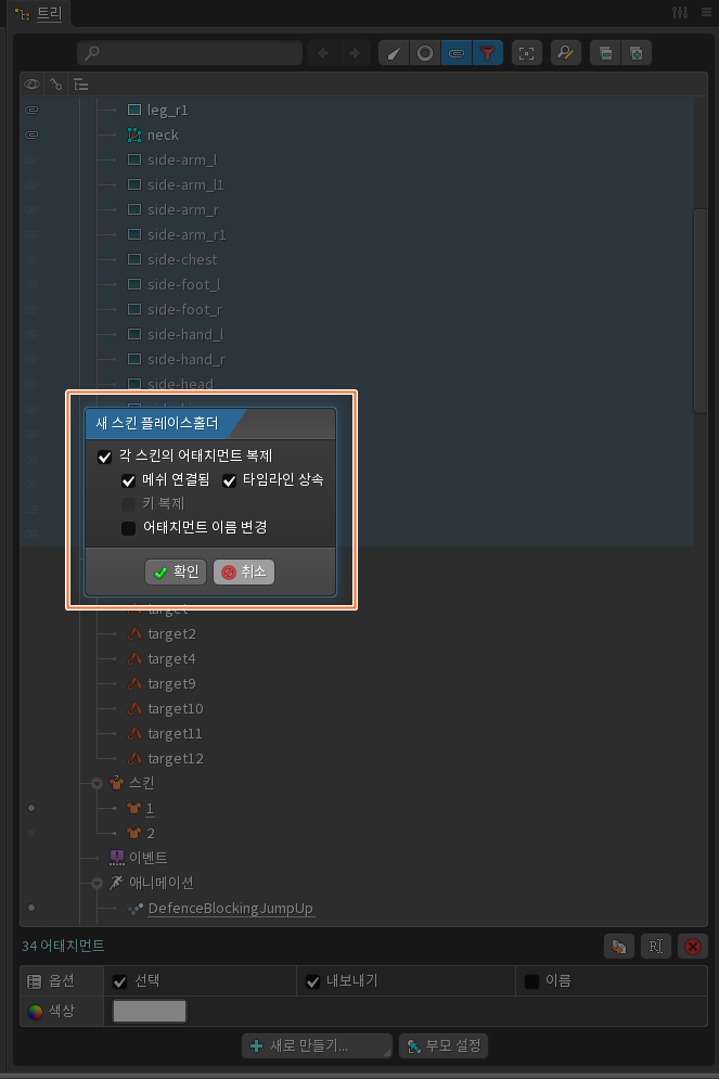 어태치먼트의 이름은 바꿔도 되고 안바꿔도 된다. 어차피 중요한건 이미지 경로이다. 각 스킨의 어태치먼트 복제, 메쉬 연결됨, 타임라인 상속 이렇게 3개만 체크 후 '확인'버튼 클릭