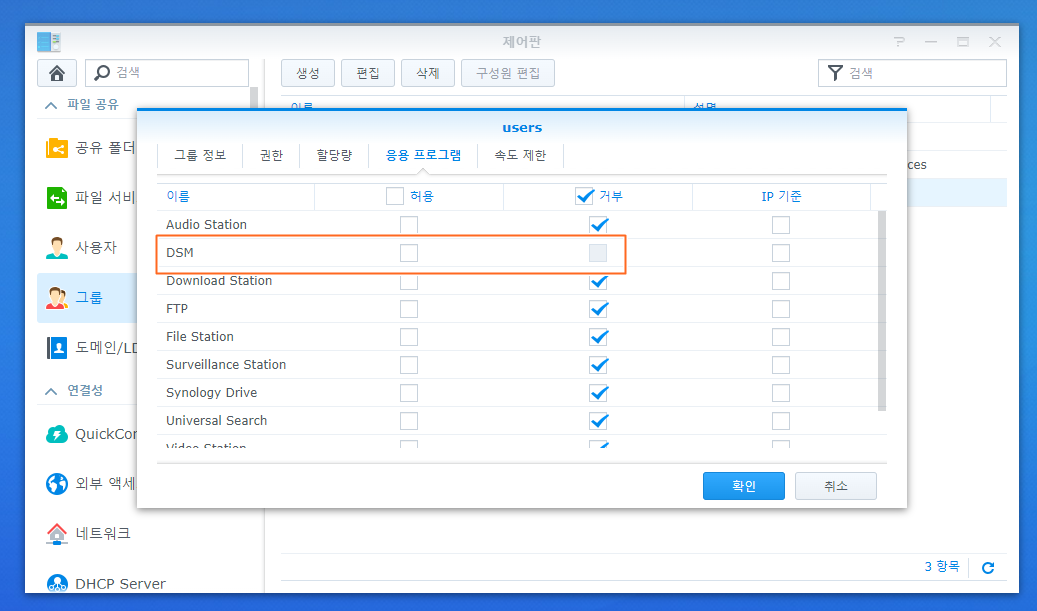 기본 생성되는 그룹 3개중 2개의 그룹 administrators, users 그룹은 응용프로그램 거부 가능 목록중 DSM에는 체크를 할 수 없게 비활성화가 되어있는데(http그룹은 활성화 되어있음) 그거 말고 다른 그룹을 새로 생성하면 DSM을 거부할 수 있게 활성화가 되어있는데 방금 새로 만든 이 그룹은 모든 응용프로그램을 거부로 체크해버리면 당연히 DSM도 거부가 된다. 이렇게 모두 거부를 체크한 상태에서