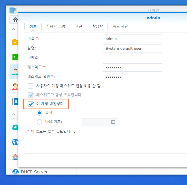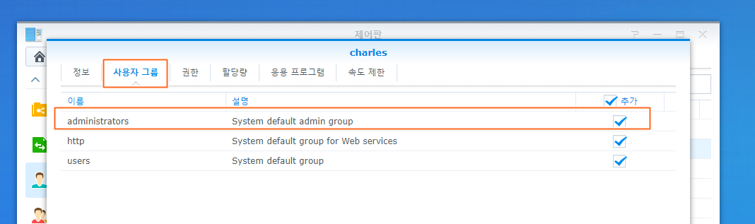 DSM > 제어판 에서 사용자 및 그룹을 생성 및 설정을 할 때