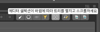 이런 상황을 가장 쉽게 해결하는 방법은 트리뷰에서 뷰파인더 모양의 아이콘을 클릭해서 활성화 하는 방법이다. 이 버튼을 활성화 하면 에디터 셀렉션이 바뀜에 따라 트리를 펼치고 스크롤 된다.