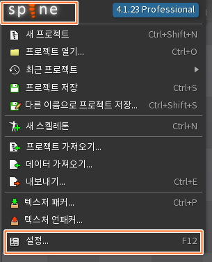 단축키를 바꾸고 싶으면 스파인 2D 화면 좌측 상단의 스파인 로고클릭 > 설정 클릭
