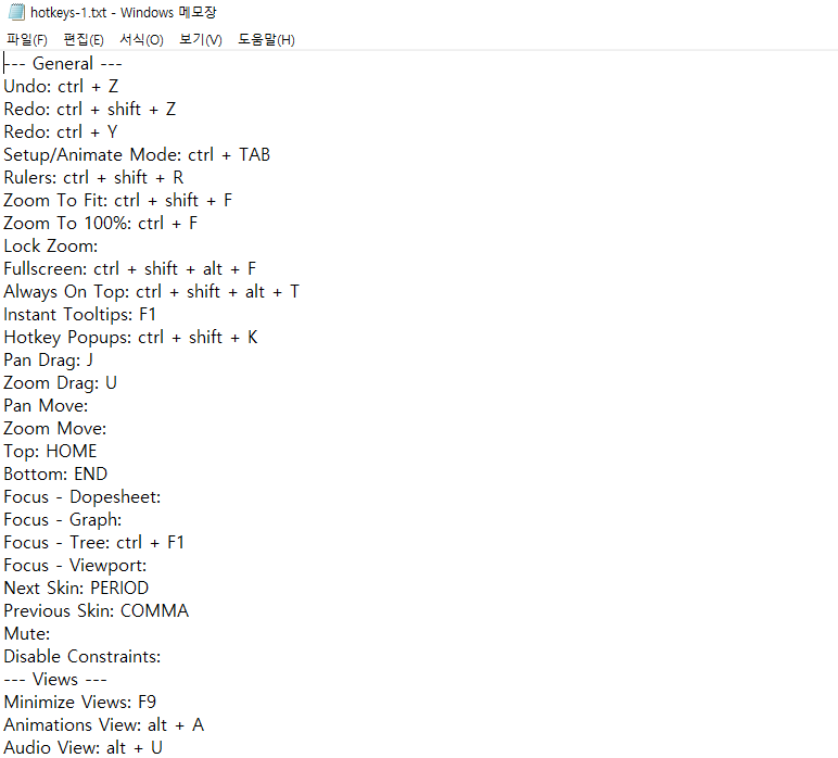 그럼 이런 hotkeys-1.txt 파일이 열리는데 거기에 필요에 따라 여러 단축키를 설정하면 된다.