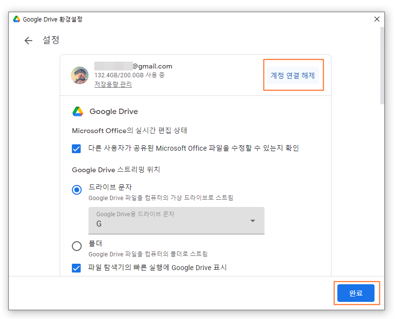 계정 연결 해제 후 처음 구글드라이브 데스크탑을 설치할 때와 같이 로그인 & 폴더 연결 등을 다시 해줘야 하는 번거로움이 있긴 하지만, X표시가 사라지고