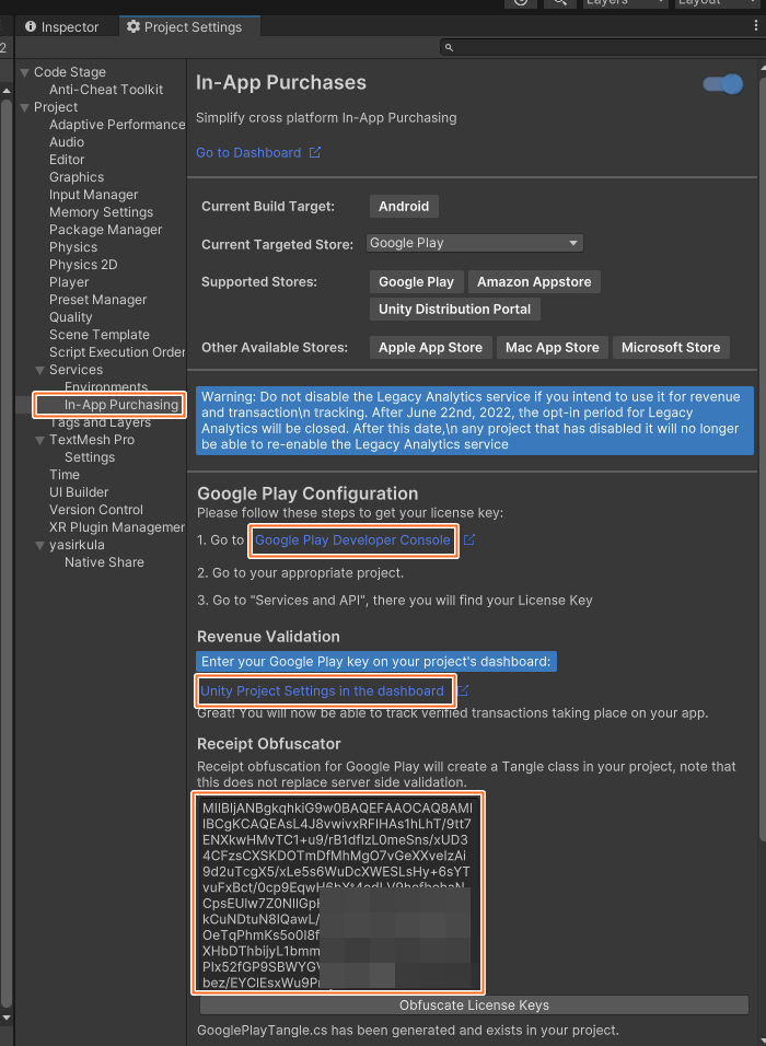 프로젝트를 복제 후 IAP관련 정보를 변경을 해줘야 하는데, Project>Services>In-App Purchasing 의 Google Play Configuration에 RSA 퍼블릭 키( 구글라이선스 키)를 입력할 때, 새로만든 프로젝트의 RSA공개키를 그냥 아래의 스샷과 같이 Google Play Configuration 의 Receipt Obfuscator 에 붙여 넣는 다면, 잘 적용되는 것 처럼 보이지만 실제로 잠시후에 기존 프로젝트의 공개키로 다시 돌아가는 걸 알 수 있다. (2024/1/21 기준), 이경우 선행되어야 할 사항은 유니티 대시보드에서 기존프로젝트에 연결되어 있는 링크를 Unlink 먼저 해준 후 지금 복제한 이 프로젝트를 잘 연결해주면 된다.