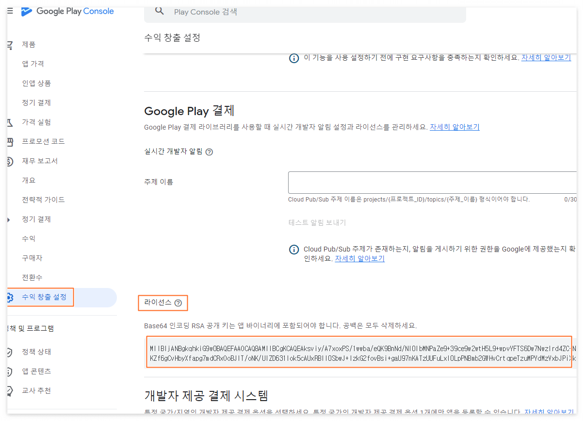 이럴 땐 위 스샷 처럼 1. Google Play Developer Console 링크를 따라가서 구글플레이 콘솔에 가서 아래 스샷처럼 '수익창출설정'에 가서 공개키를 일단 복사해 온 후