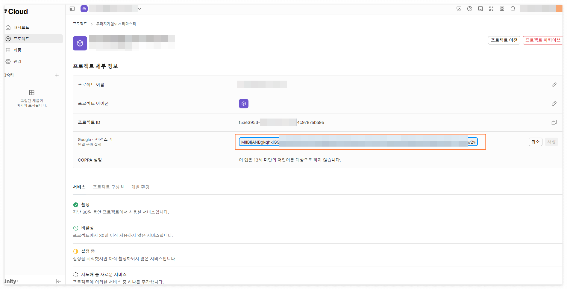 아까 맨 위 스샷의 Unity Project Settings In The Dashboard 링크를 타고 프로젝트의 대시보드로 간 후 아래 스샷과 같이 Google 라이선스 키에다가 입력을 해준 후 저장을 하면 이제 모든 게 잘 된다.