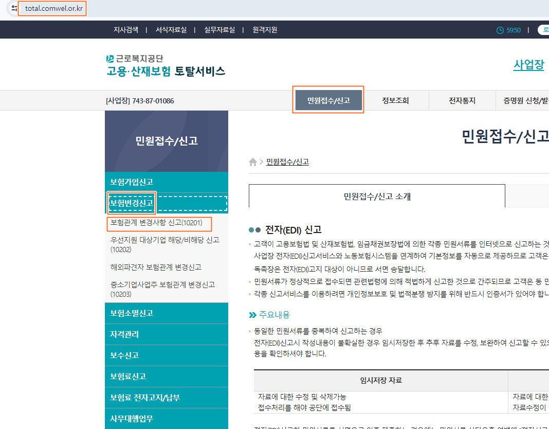 민원접수/신고 > 보험변경신고 > 보험관계 변경사항 신고(10201) 로 들어가서 변경신고를 하면 된다.