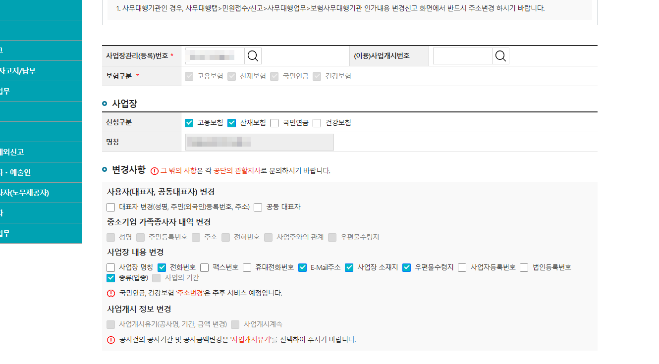 고용보험, 산재보험은 저기 체크된 것들이 모두 변경신고 가능하지만, 국민연금, 건강보험은 주소변경 신고는 아직 지원하지 않는다. 저 두개를 체크를 하면 아래쪽 변경하려고 했던 체크들이 다시 풀려버린다. 재확인필수.